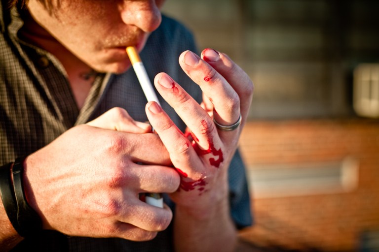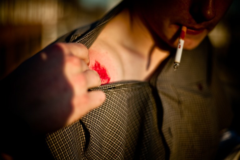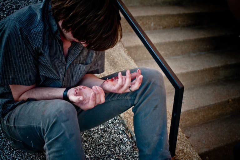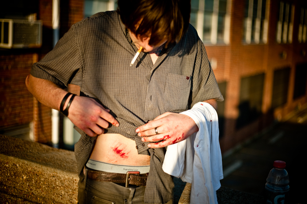 Adam met up with Seel and I at shitside today and we headed to this 22 stair rail into a bank so we could talk him into trying a trick. After he landed a trick for me (to be seen at a later date) he started trying a crazy trick that got the best of him and he went soaring into the bank on his stomach. If you’ve seen Adam skate you might think he’s a machine, but here’s some proof that he bleeds.